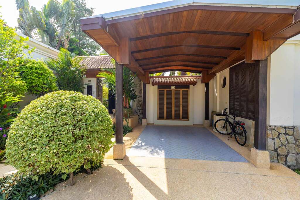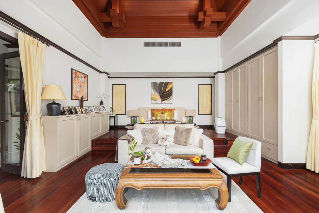 Sai Taan Villa showcases a beautiful Thai-contemporary exterior design, blending traditional Thai architecture with modern elegance. Featuring stunning pitched roofs, natural materials, and tropical landscaping, the villa creates a serene and timeless atmosphere that perfectly complements its luxurious interiors.